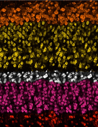 Pseudo-colored cell layers of the Entorhinal cortex demonstrating the diversity of cell types in the entorhinal cortex. Our image featured as the cover image of Neuron